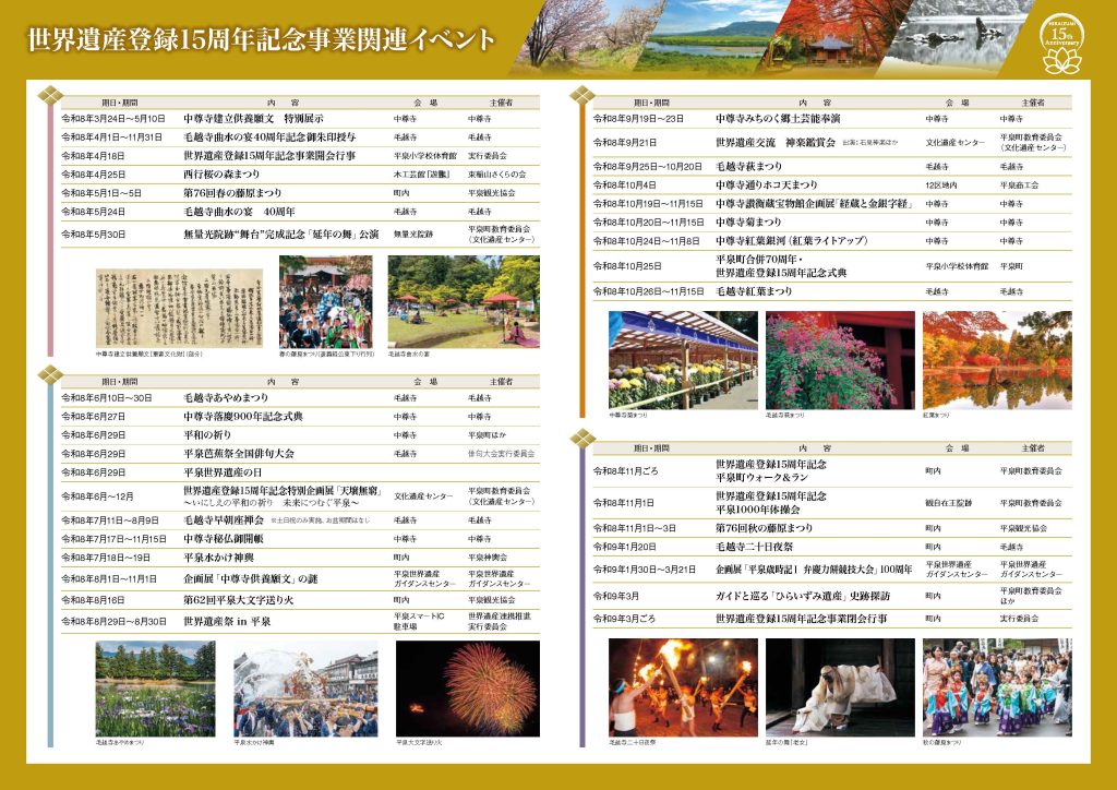 平泉町の文化遺産が世界遺産に登録されて15周年を迎える今年、町内では15周年を記念する関連イベントが次のとおり開催されます。