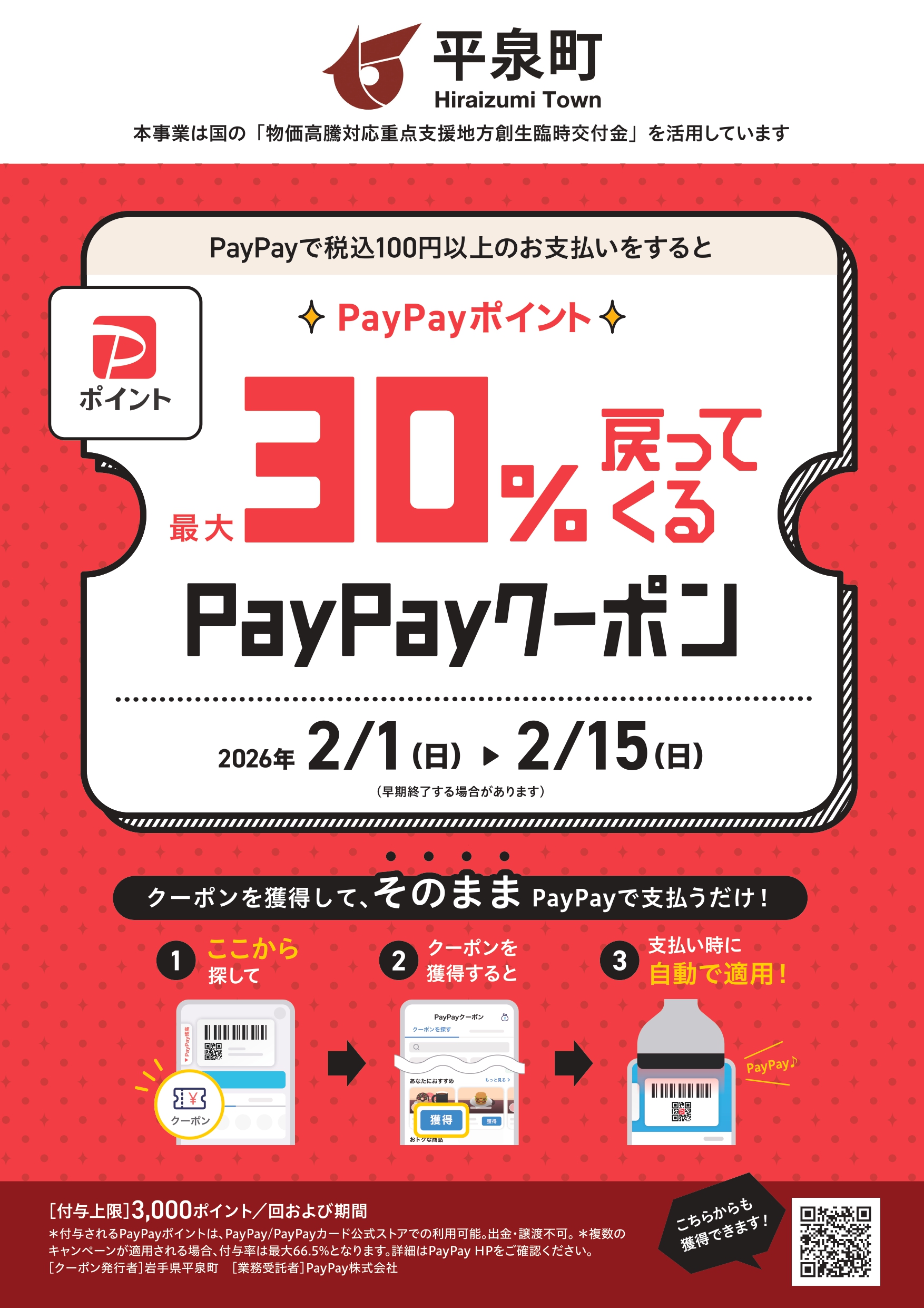物価高騰の影響を受ける町内事業者・消費者支援として、PayPay決済を利用したポイント還元事業を実施します。