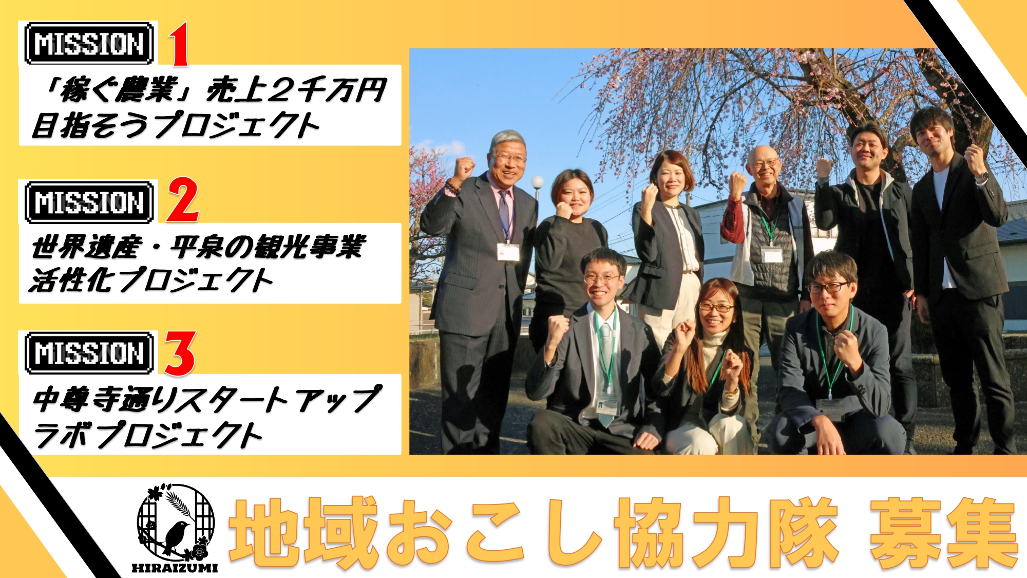 地域の特徴を活かして平泉町内の活性化を図るために、地域の方々や行政と一緒になって地域おこし活動業務に従事し、ひいては平泉町内で起業又は就業し、定住していただける意欲あふれる「地域おこし協力隊」を募集いたします。