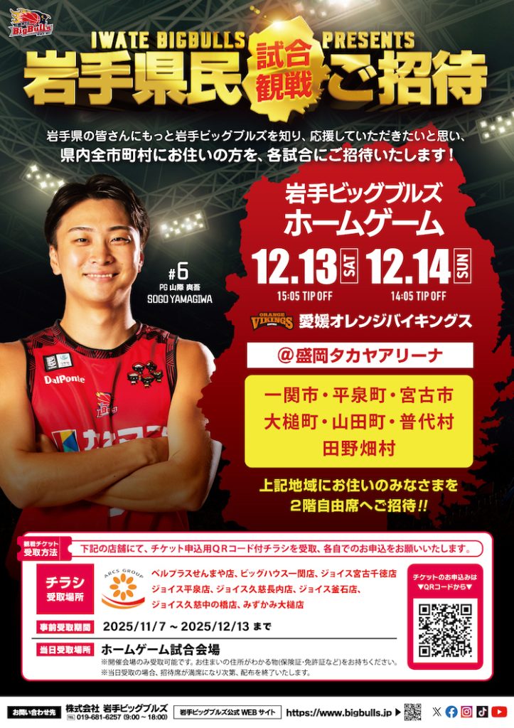 盛岡市をホームタウンとするプロバスケットボールチーム『岩手ビッグブルズ』が、岩手県全33市町村の県民を試合に無料招待するプロジェクトで、平泉町が12月13日(土)、14日(日)、盛岡タカヤアリーナで開催されるホームゲームに招待されています。(一関市・宮古市・大槌町・山田町・普代村・田野畑村と同日)